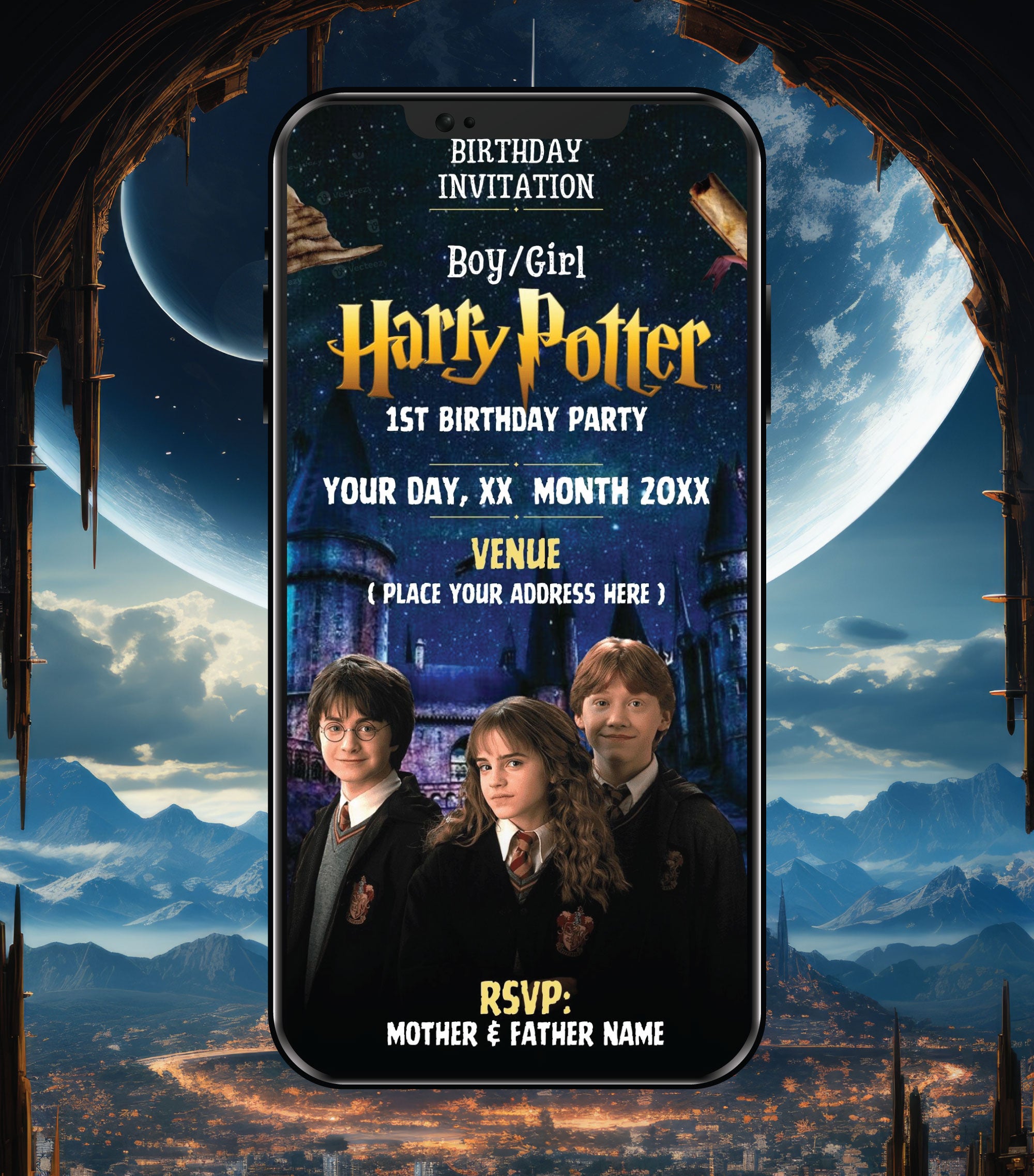 Featuring a Hogwarts-inspired design with iconic wizarding visuals, castle backdrops, golden typography, and spellbook elements, this digital invitation beautifully captures the fantasy and wonder of the beloved series. It’s ideal for both boys and girls who adore the charm of magic, wands, and wizardry.