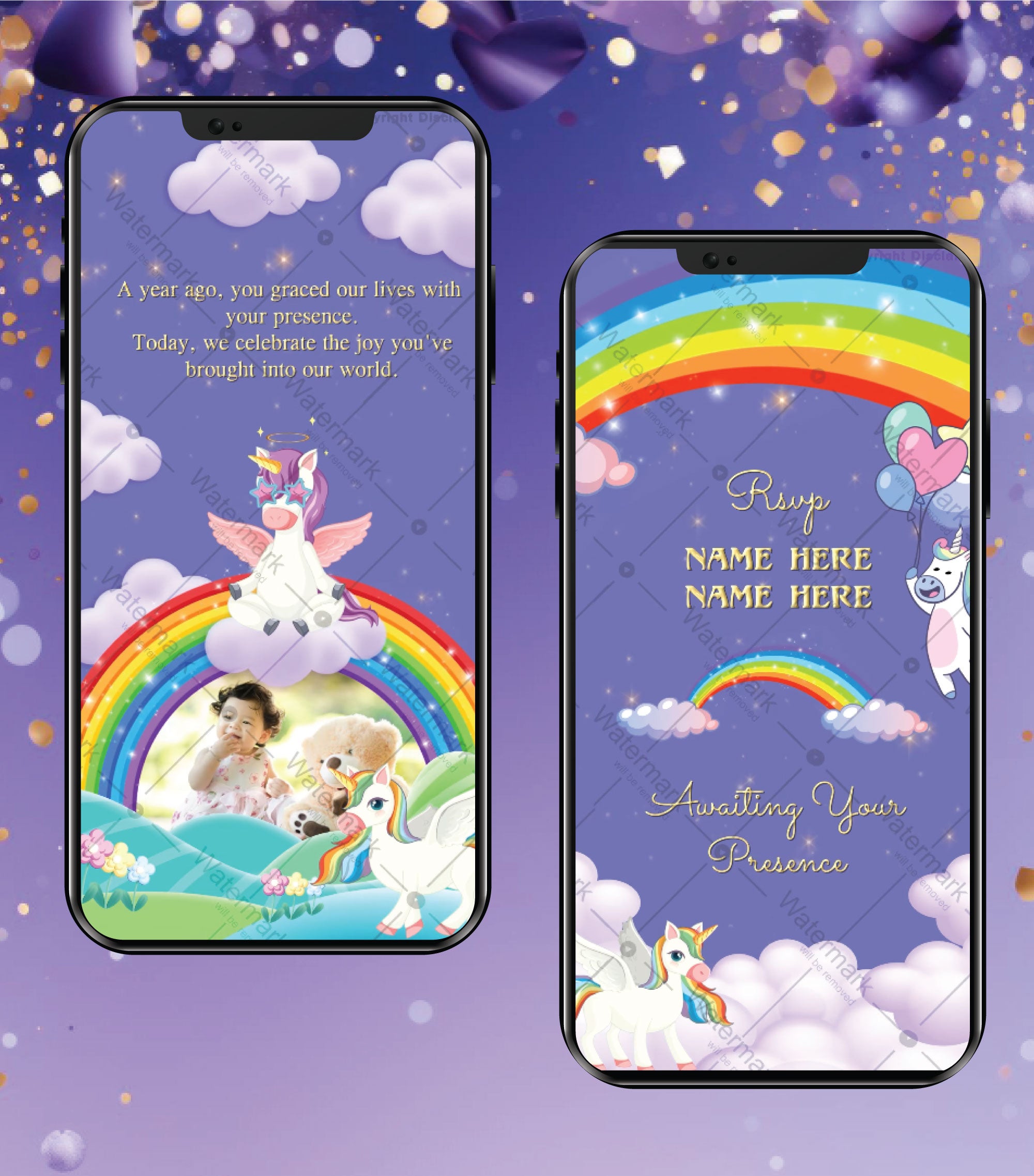 This premium MP4 video features a cheerful unicorn, rainbow arcs, glittering clouds, and fantasy castle elements that create a whimsical, dreamy setting. It is perfect for baby girls and boys, and can be customized with your child’s name, age, date, time, venue, and RSVP details.
