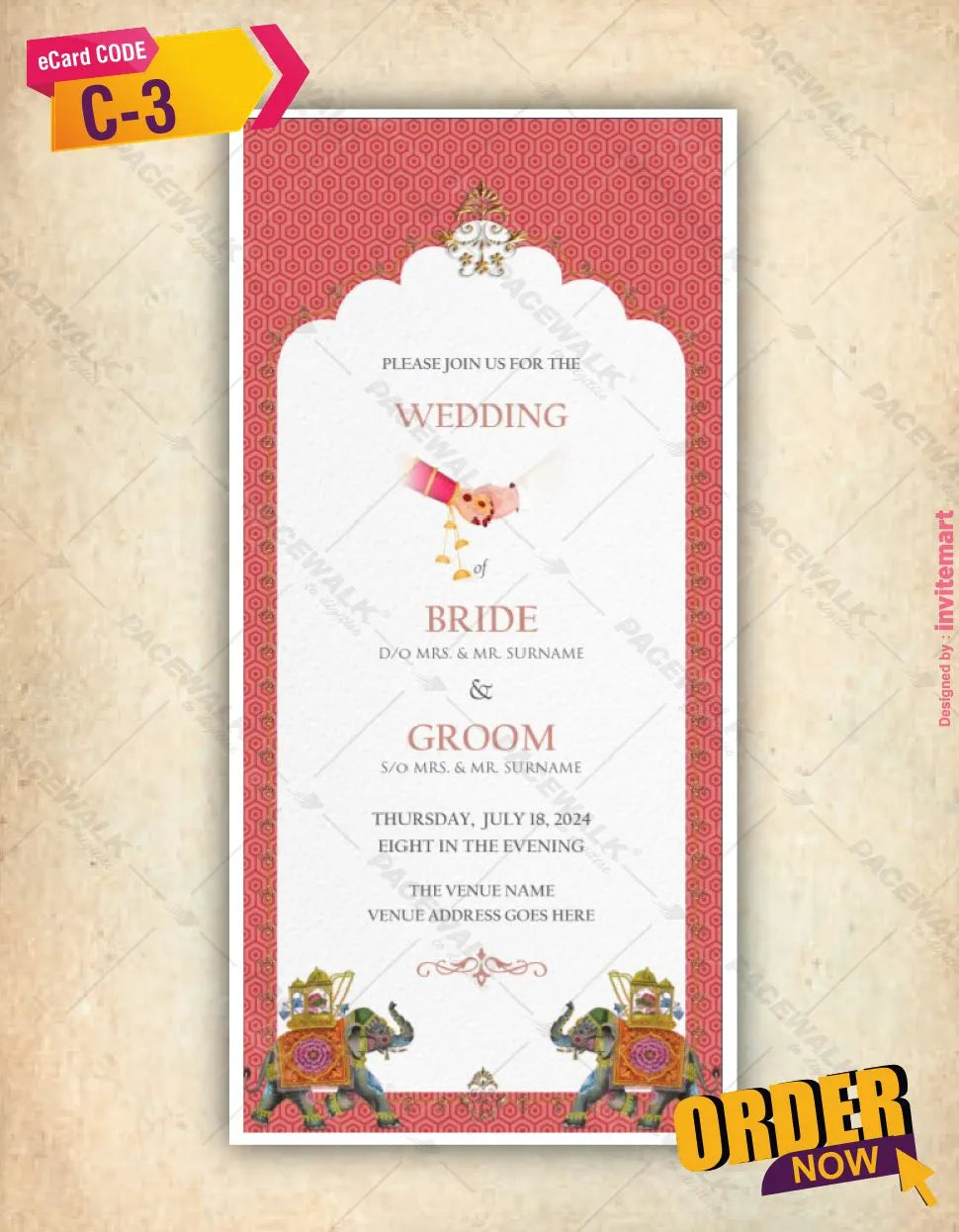 The design showcases intricate traditional motifs such as elephants, floral borders, and sacred symbols, all beautifully arranged on an elegant ivory background with striking red and gold accents. This combination creates a sophisticated yet cheerful aesthetic, ideal for couples who want to give their wedding announcement a lively, memorable personality.