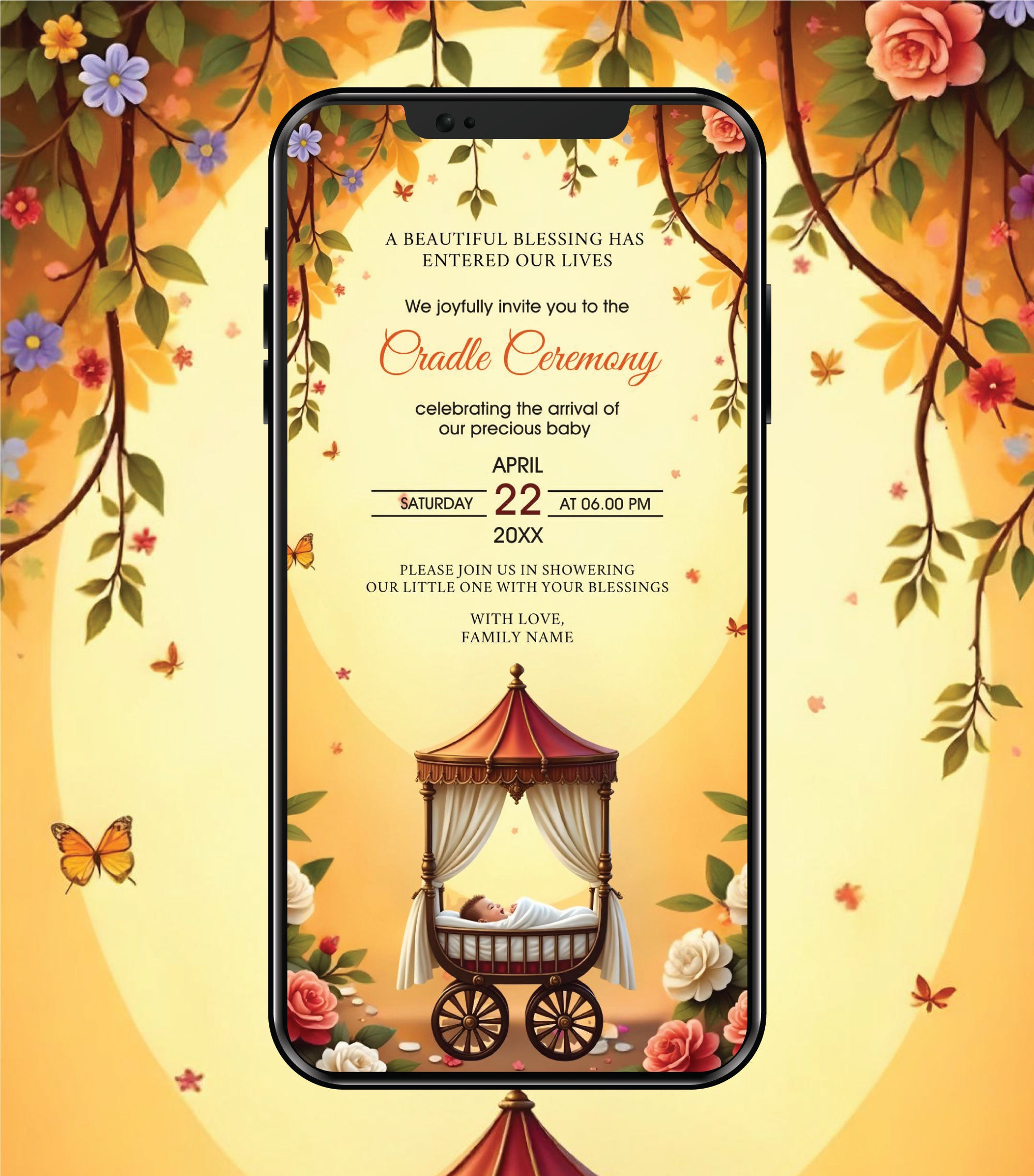 Celebrate the joyful arrival of your little bundle of happiness with this Cradle Ceremony Digital Invitation Card. Designed in a soft, elegant pastel theme, this baby welcome e-invite features a charming cradle illustration surrounded by delicate floral elements and warm festive tones that beautifully capture the emotion of welcoming a newborn.