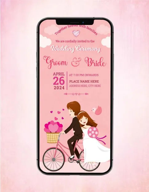 #CartoonCoupleInvite #WeddingBicycleTheme #CuteBrideAndGroomCard #DigitalWeddingInvitation #WhatsAppWeddingCard #EcoFriendlyInvite #CustomizableWeddingCard #YoungLoveInvitation #RomanticWeddingDesign #WeddingEInvite #PaperlessWeddingCard #WeddingSaveTheDate #CoupleIllustrationInvite #FloralWeddingInvitation #PastelPinkWeddingCard #WeddingAnnouncementCard #BrideAndGroomDigitalCard #WeddingCardForWhatsApp #WeddingReceptionInvite #OnlineWeddingCard