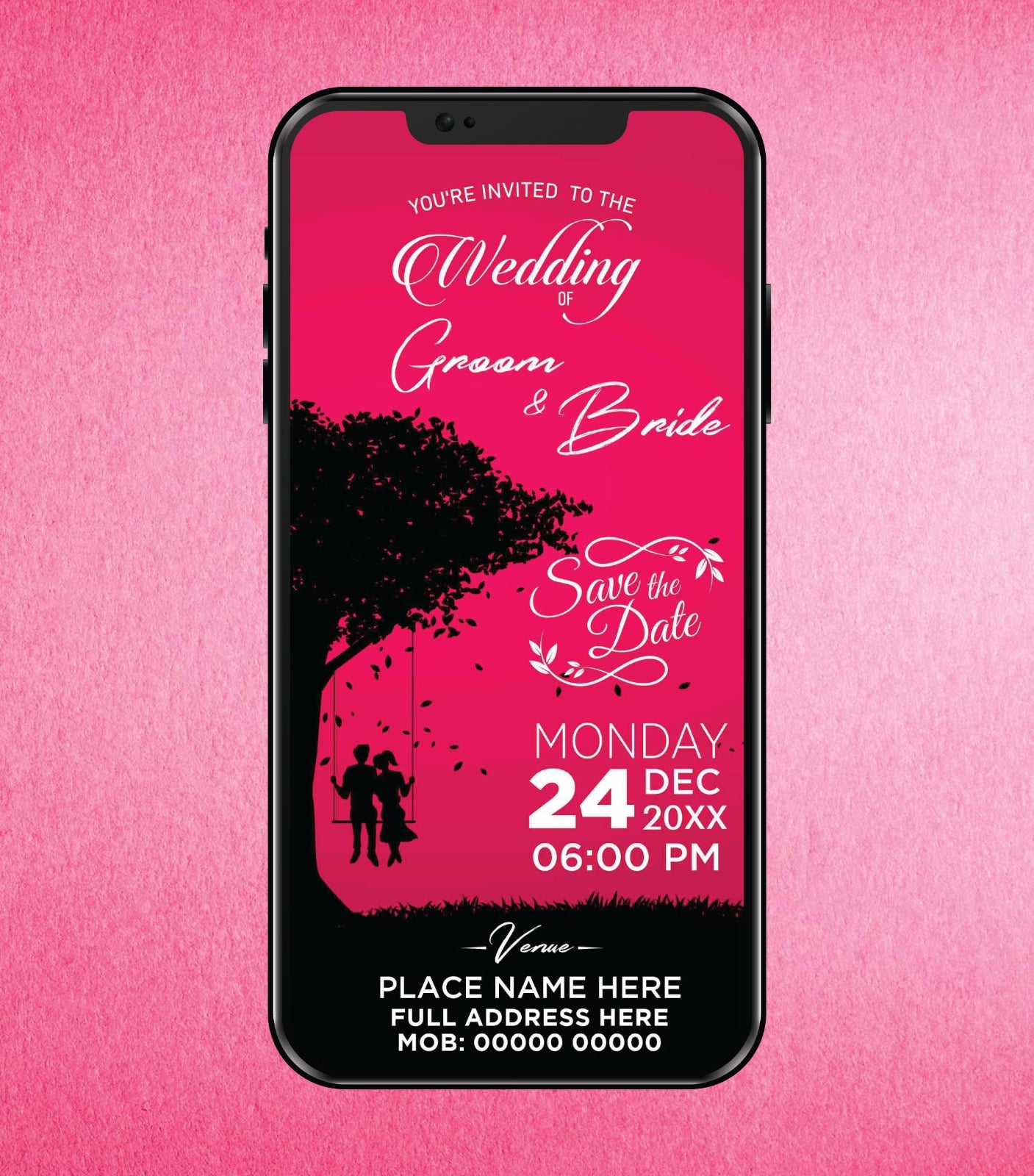 Create a memorable first impression with this Romantic Swing Silhouette Wedding Invite | Pink & Black Save The Date Card | W-76 from Invitemart. Perfectly designed for modern couples, this digital wedding invitation card features a romantic swing silhouette of a couple under a tree, symbolizing love and togetherness. The bold combination of pink and black adds a dramatic yet classy vibe, making this Save The Date card truly stand out.