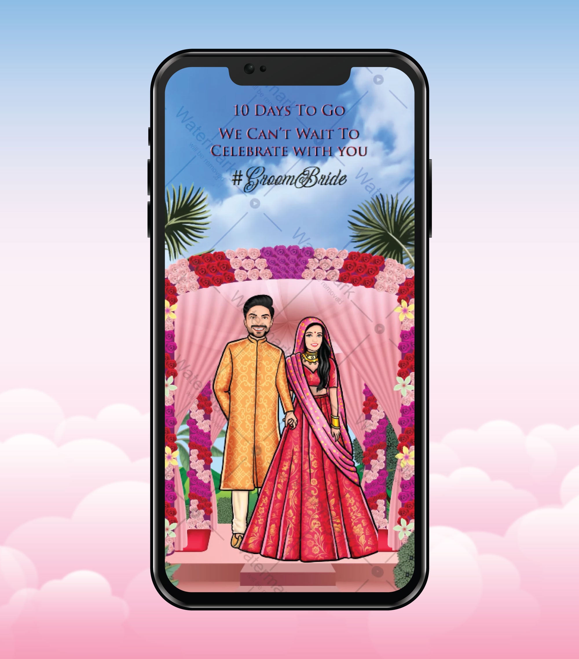 This video features a traditional Indian caricature couple dressed in royal wedding attire, set against a vibrant floral mandap backdrop with pink skies and festive décor. The video creatively counts down the days to your wedding, creating emotional connection and enthusiasm among your guests.