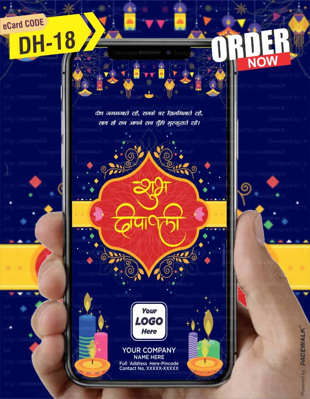 The elegant layout features bold “Shubh Deepawali” typography in Hindi, a royal blue background, glowing diyas, and gold accents, symbolizing prosperity and light. Each eCard is fully customizable with your company logo, name, address, contact details, and festive wishes, creating a personalized touch that resonates with clients, partners, and employees.