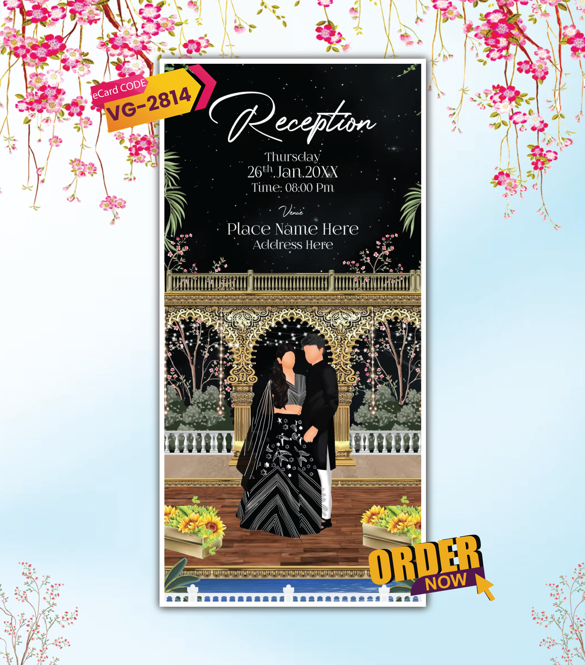 Celebrate your grand Indian wedding with this beautifully illustrated Multi-Event Caricature Wedding Invitation Video. Featuring a majestic Ganesha entrance and royal palace visuals, this animated e-invite is perfect for weddings with multiple functions. The visuals include floral decor, peacocks, fountains, and intricate Indian motifs — ideal for traditional yet luxurious celebrations.