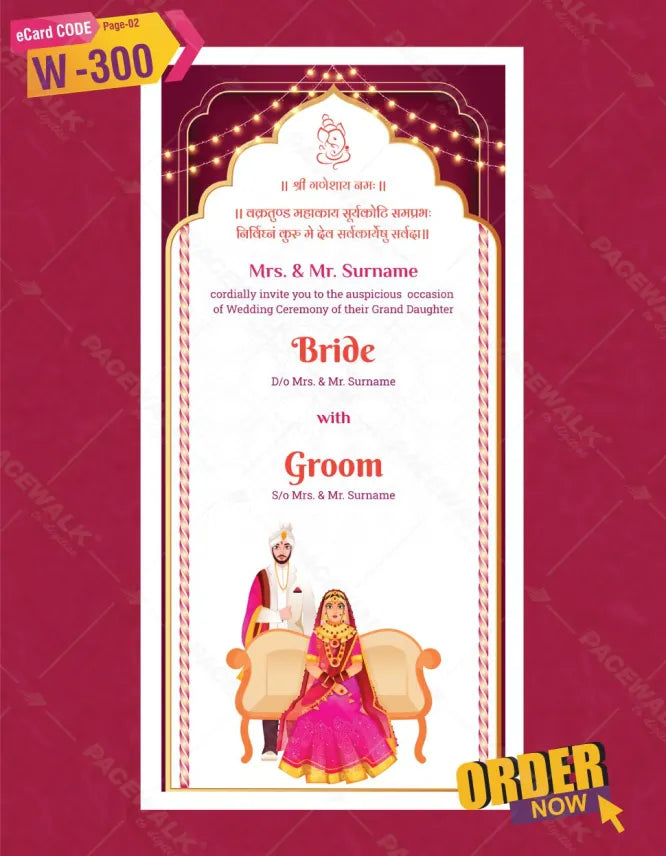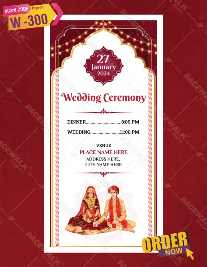 This set includes two coordinated cards that complement each other beautifully. The Cover Invitation features symbolic motifs such as the bride and groom hand clasp, golden floral borders, and a rich traditional layout that sets the tone for your wedding celebrations. The Ceremony Card showcases adorable cartoon-style bride and groom illustrations seated on a royal sofa, giving a personalized and contemporary twist to the classic design.