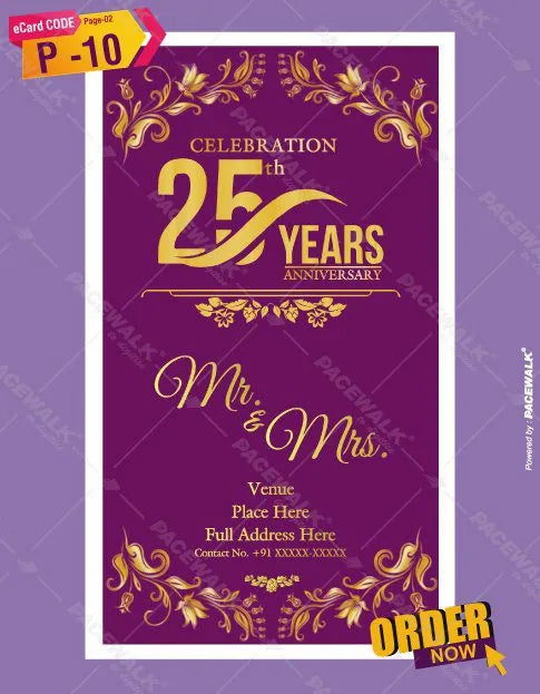 Celebrate a beautiful milestone with this 25th Anniversary Invitation Card | Royal Purple & Gold Digital E-Invite (P-10). Perfectly designed for your Silver Jubilee celebration, this digital invitation blends royal elegance with a touch of festivity. The rich purple background paired with intricate golden accents creates a sophisticated and regal vibe, ideal for commemorating 25 years of togetherness.