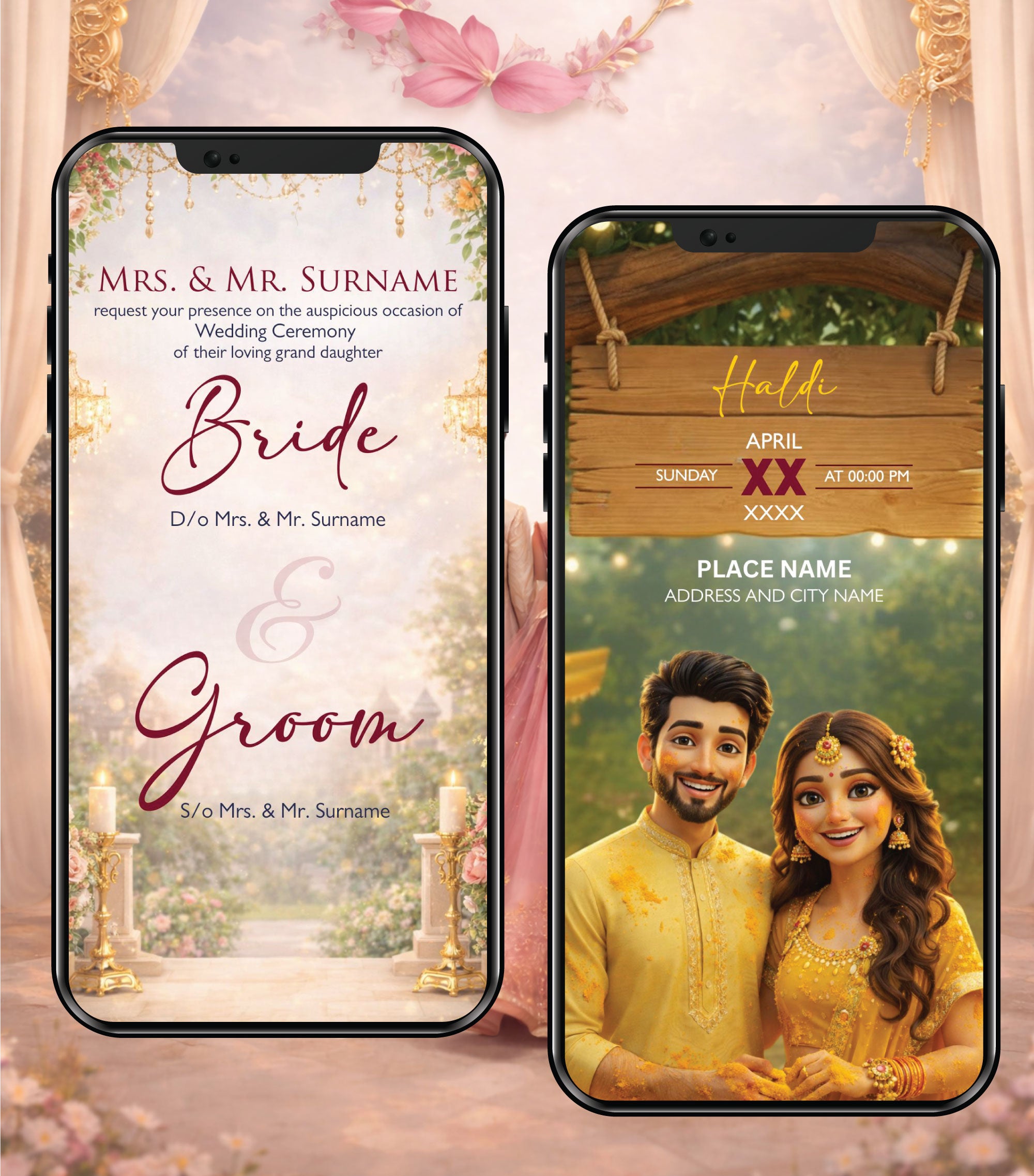 The set includes beautifully coordinated invitation pages for Wedding Ceremony, Haldi, Mehndi, Sangeet, and Reception, ensuring visual consistency across all your events. The bride and groom illustrations are styled elegantly, creating a warm, celebratory feel while maintaining a refined and premium aesthetic. Floral wreath monograms, golden accents, and soft lighting enhance the overall sophistication of the design.