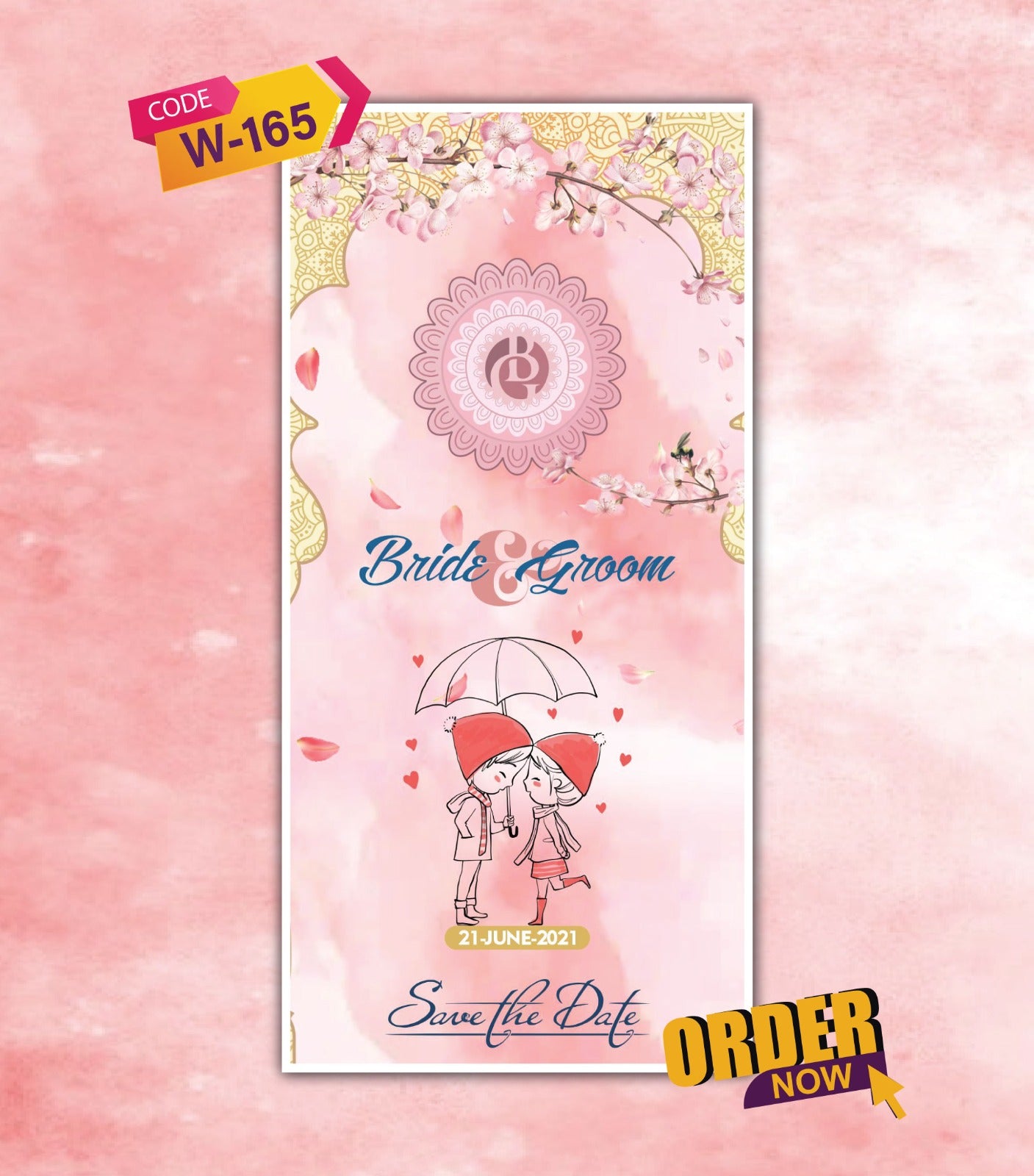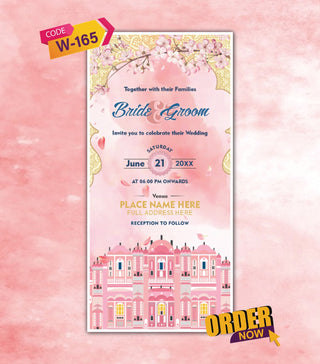 Celebrate love under a shower of romance with this Best Creative Wedding Invitation Card | W-165, featuring an enchanting couple illustration beneath a red heart umbrella. Set against a soft pink background adorned with cherry blossoms and palace elements, this design beautifully balances luxury and intimacy.