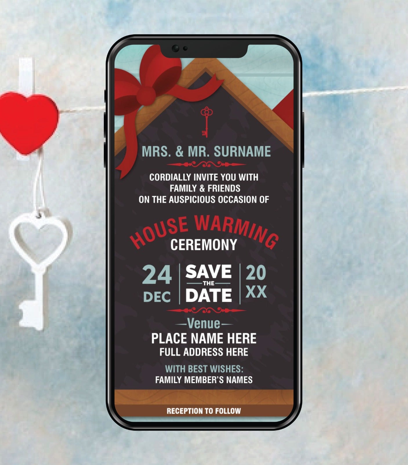 Fully editable with your name, venue, date, time, and RSVP, this digital card is perfect for WhatsApp sharing or email delivery. Whether you're celebrating your first home or a new chapter, this eCard combines elegance and excitement in every frame.