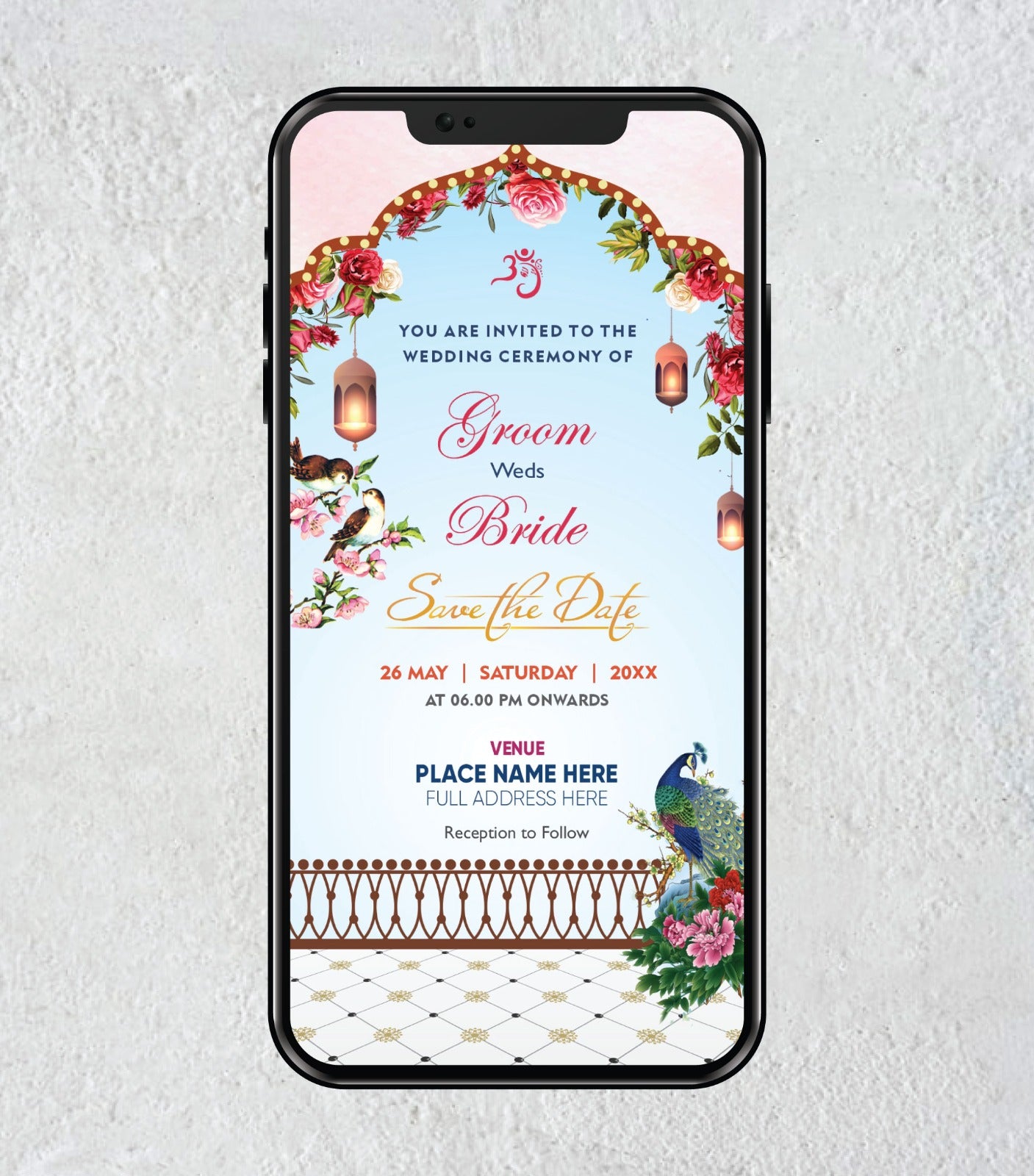 Featuring auspicious symbols like Om, doves, and traditional motifs, this eCard captures the richness of Indian heritage while offering the convenience of modern digital sharing. Fully editable with your names, date, venue, and RSVP, it’s ideal for WhatsApp, email, and social media. Perfect for couples seeking a timeless and culturally vibrant wedding invitation.