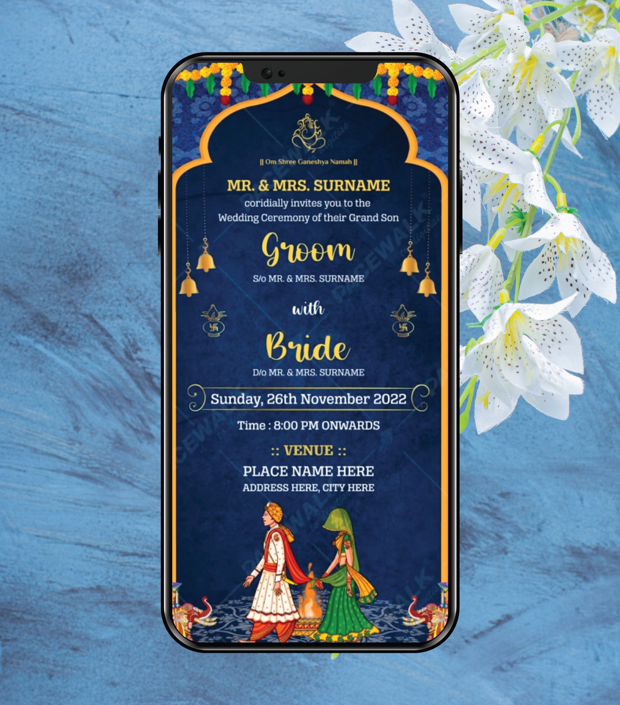 Celebrate your royal Indian wedding with this elegant Royal Elephant Theme Wedding Invitation, designed in a luxurious blue-gold palette. Featuring beautifully illustrated wedding elephants, hanging lanterns, temple bells, floral accents, and a regal mandap-style border, this video e-invite brings a majestic traditional charm. Fully customizable with names, date, venue, timings, and RSVP details, this vertical wedding video is perfect for WhatsApp, Instagram, and social media sharing.