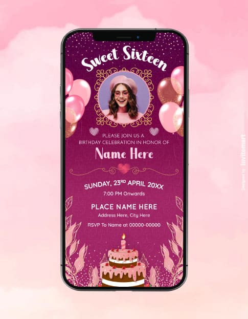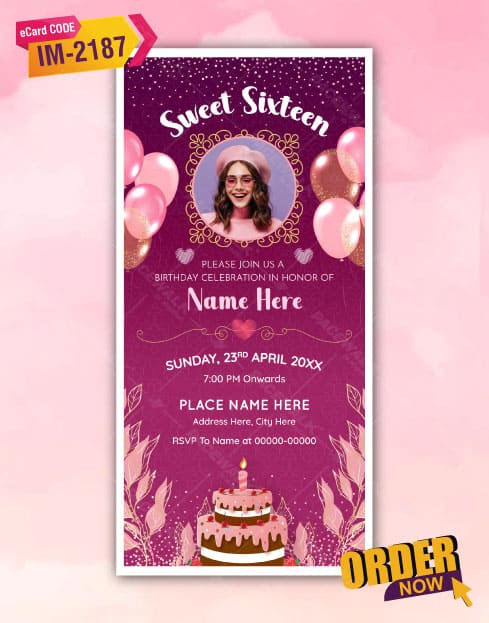 Celebrate the milestone of turning sixteen with this Sweet Sixteen Birthday Invitation Card | IM-2187, designed to bring elegance and excitement to her special day. Featuring a rich blend of pink and purple hues with glowing elements, sparkles, and balloons, this digital birthday eCard perfectly captures the joy of the occasion. The central photo space allows you to add the birthday girl’s picture, making it a truly personal and memorable invitation.